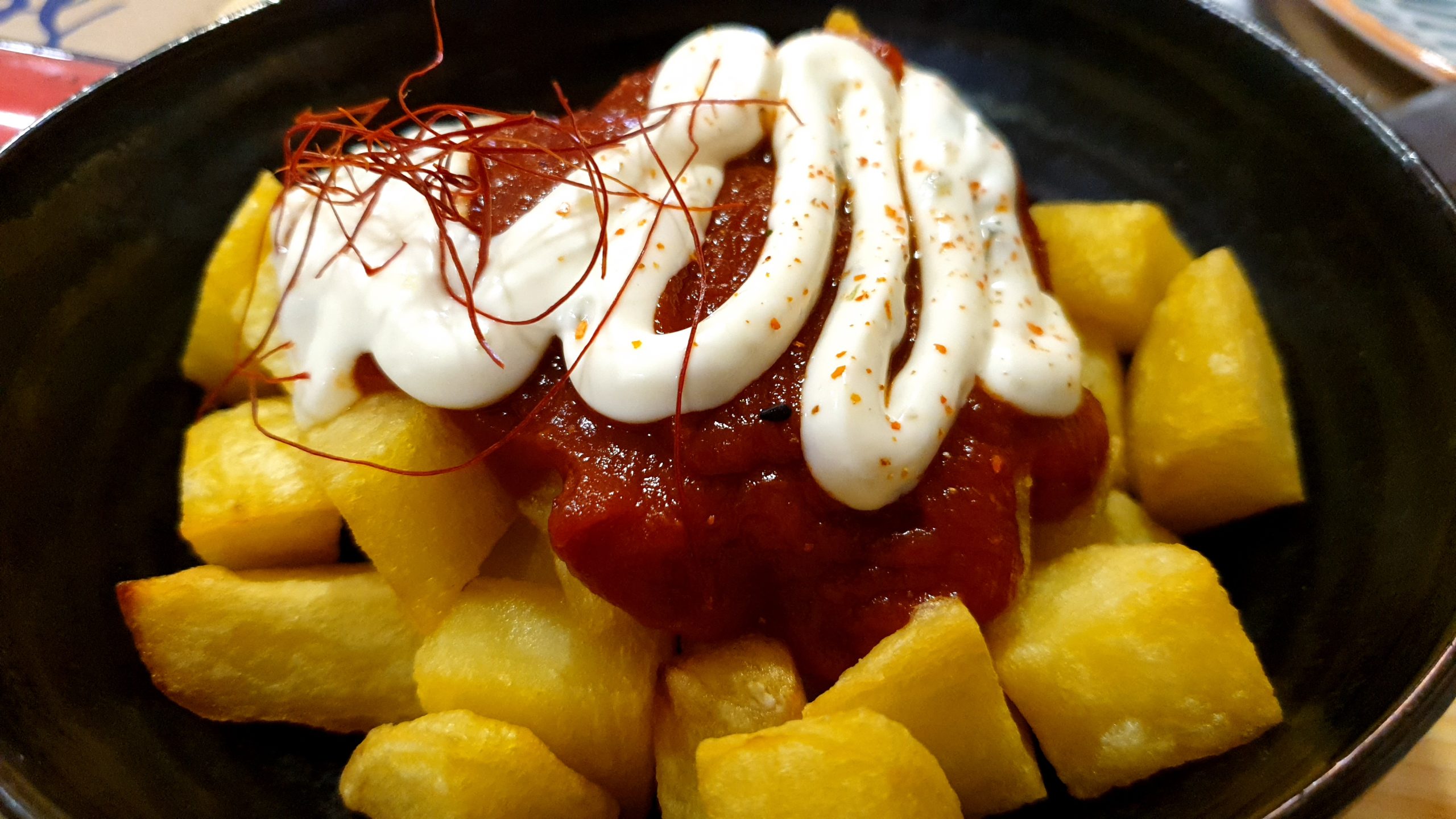 Para completar el picoteo previo a lo que vendrá, y mientras nos instalan en la mesa la botella de sidra para regar lo que queda, decidimos atacar las patatas bravas con salsa tártara. Y muchos dirán que unas patatas con salsa las hace cualquiera, y es verdad. Pero no cualquiera las hace bien. Las patatas están fritas perfectamente y cortadas en trozos, con una corteza bien crujiente y un interior suave. Para los que teman este plato porque pique mucho, hay que decir que la mezcla de la salsa de tomate con la tártara crea un equilibrio en el que el pique es el justo.
