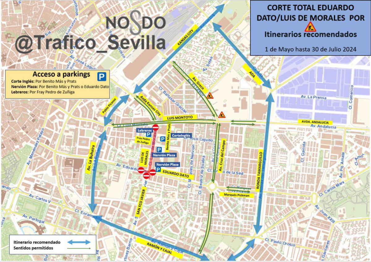 Desde el 1 de mayo y hasta el 30 de julio, el cruce de San Francisco Javier con Eduardo Dato estará cortado al tráfico, lo que se suma al corte de Luis de Morales, que se mantendrá cerrada hasta el 15 de septiembre. Aunque se puede transitar por avenidas amplias cercanas como Luis Montoto o la Avenida de la Cruz del Campo, desde Emergencias Sevilla recomiendan tomar como alternativas mientras duren los cortes: Ramón y Cajal, Avenida de la Buhaira, Pablo Picasso, Kansas City, Ada y la Ronda del Tamarguillo.